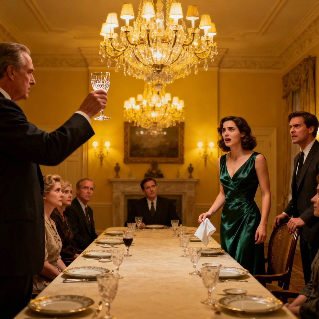 He stood so abruptly that a couple of glasses rattled. He moved to stand beside me, tall, steady, his presence suddenly larger than anyone else’s in the room. He picked up his own glass, the stem flashing briefly in the chandelier light.