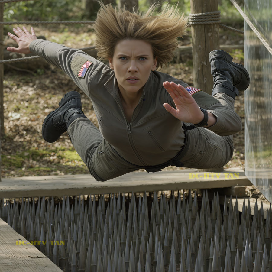 Instead of a long jump, she performed an explosive vertical bound, clearing the pit entirely and landing with a feather-like roll that absorbed all kinetic energy. Her boots didn’t even displace the pine needles that concealed the perimeter lip. The camera positioned at ground level captured the fluid, almost impossible movement. A dancer’s grace combined with a spider’s understanding of structural physics.